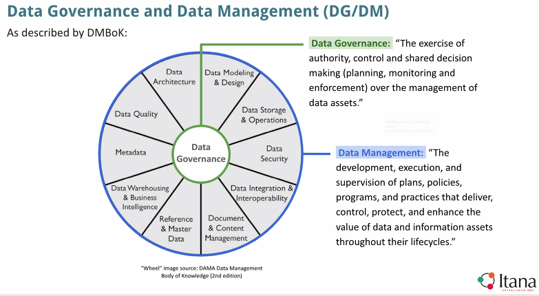 DG ensures that data is accurate, consistent, secure, and accessible, guiding how it is collected, stored, processed, and used at every level of an organization. It establishes clear roles and responsibilities for data management, sets standards for data quality, and provides a structured approach to compliance and risk management. Through DG, organizations can unlock the full potential of their data, improve decision-making, foster transparency, and maintain data integrity throughout its lifecycle. As clearly seen in the pic above DG is centered on everything data.